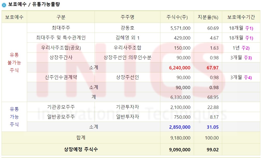 기관 공모주주의 비율이 높은 만큼 향후 수요예측 결과에 따른 의무확약 비율을 주의깊게 확인해봐야 합니다.