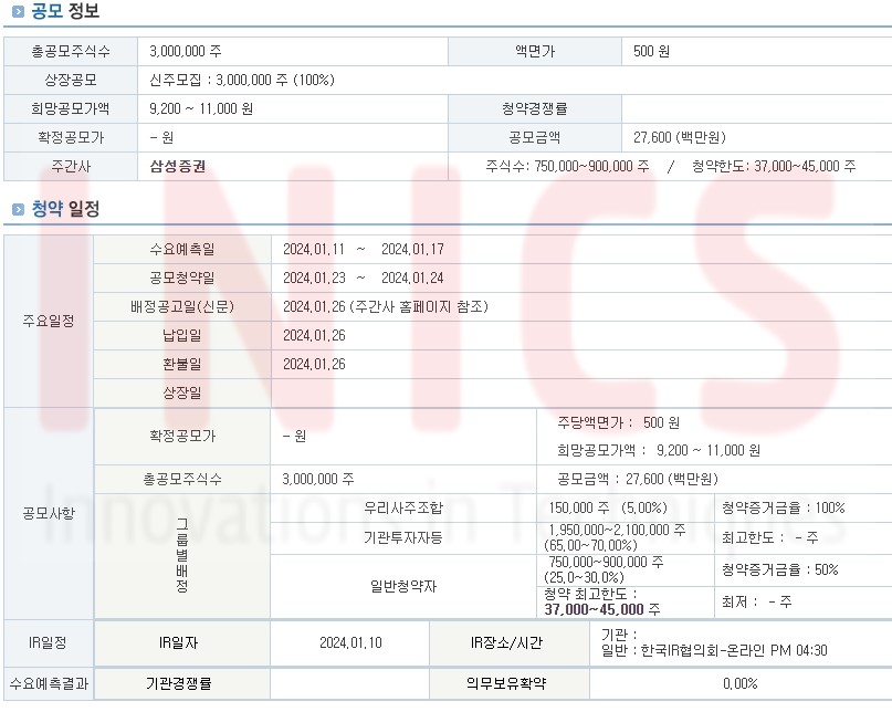 공모 청약일: 2024년 1월 23일 ~ 24일 (2일간)