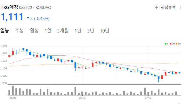 현재 TKG애강의 주가는 1111원이며, 시가총액은 약 3000억 원입니다.