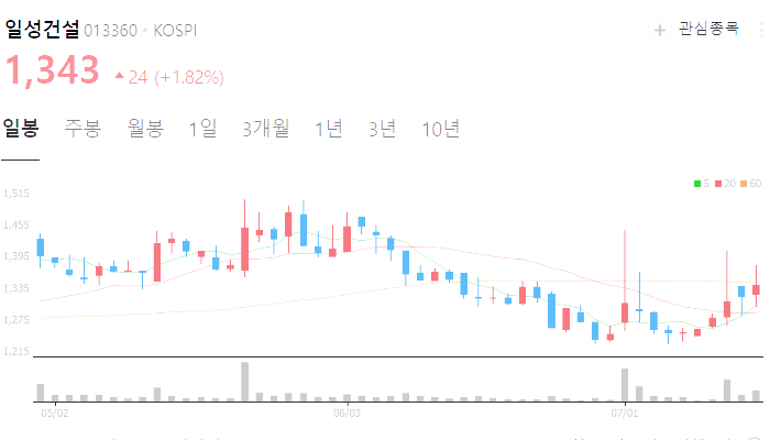 현재 일성건설의 주가는 1343원이며, 시가총액은 약 726억 원입니다.