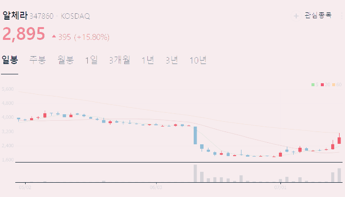 현재 알체라의 주가는 약 2895원이며, 시가총액은 637억원입니다.