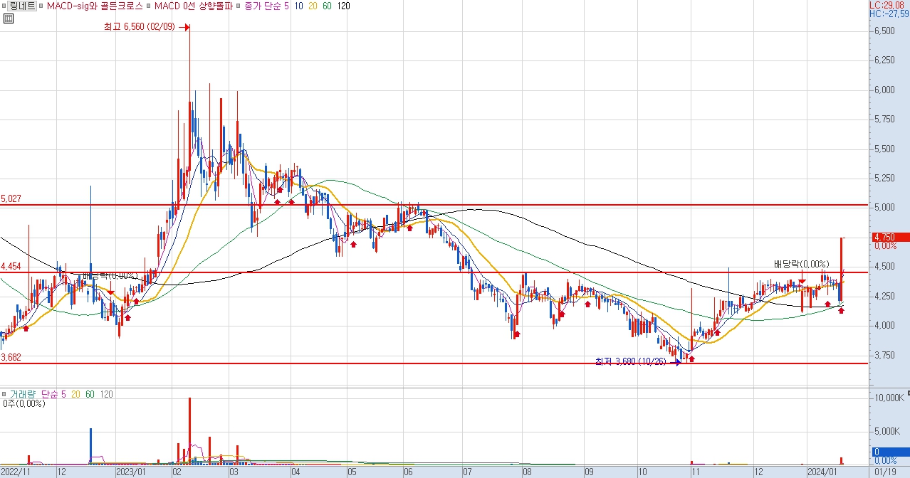 링네트 일봉 차트를 살펴 보면 5000원을 저항으로 두고 3680원을 지지후 주가 반등세에 놓여져 있습니다.