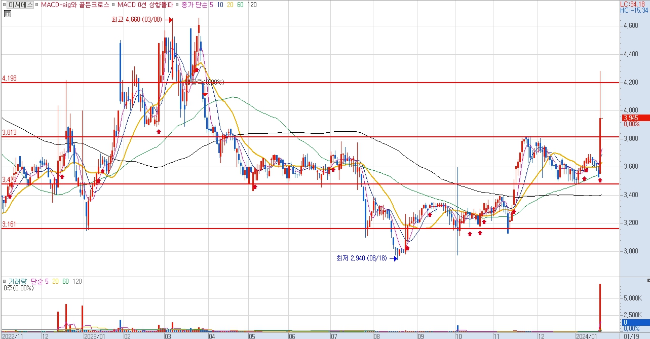 이씨에스 일봉 차트를 살펴 보면 4100원 구간을 저항으로 두고 계단식 하락을 중장기 적으로 하던 이씨에스 주가는 3160원 구간을 딛고 반등 중입니다. 향후 추가적인 상승도 기대해 볼수 있을 것으로보여 집니다.
