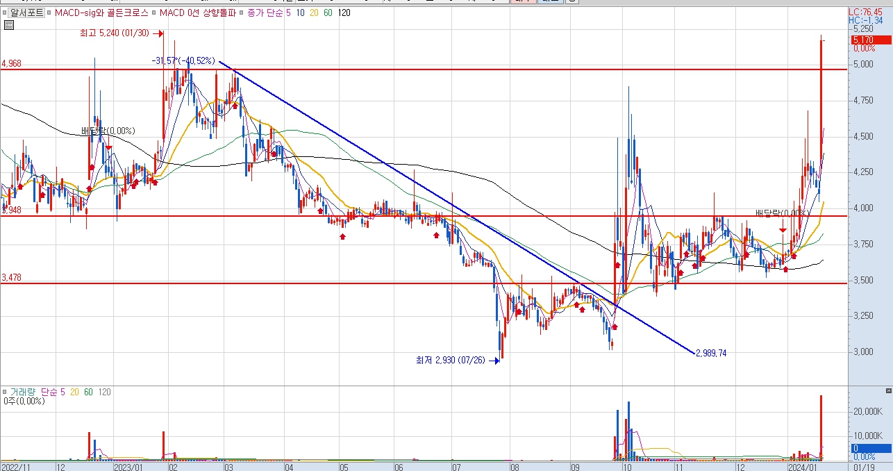 알서포트 일봉 차트를 살펴 보면 2023년 1월 부터 중장기 추세를 만들며 하락하던 알서포트 주가는 2023년 10월 대량 거래량과 함꼐 주가 반등세를 하고 있는 분위기 입니다.