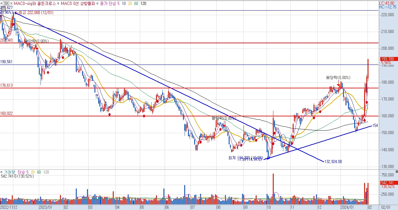 SK주가는 2022년 11월부터 중장기 하락 추세를 이어오다 2023년 10월 바닥을 딛고 중기적인 우상향 추세선을 만들어 가고 있습니다.