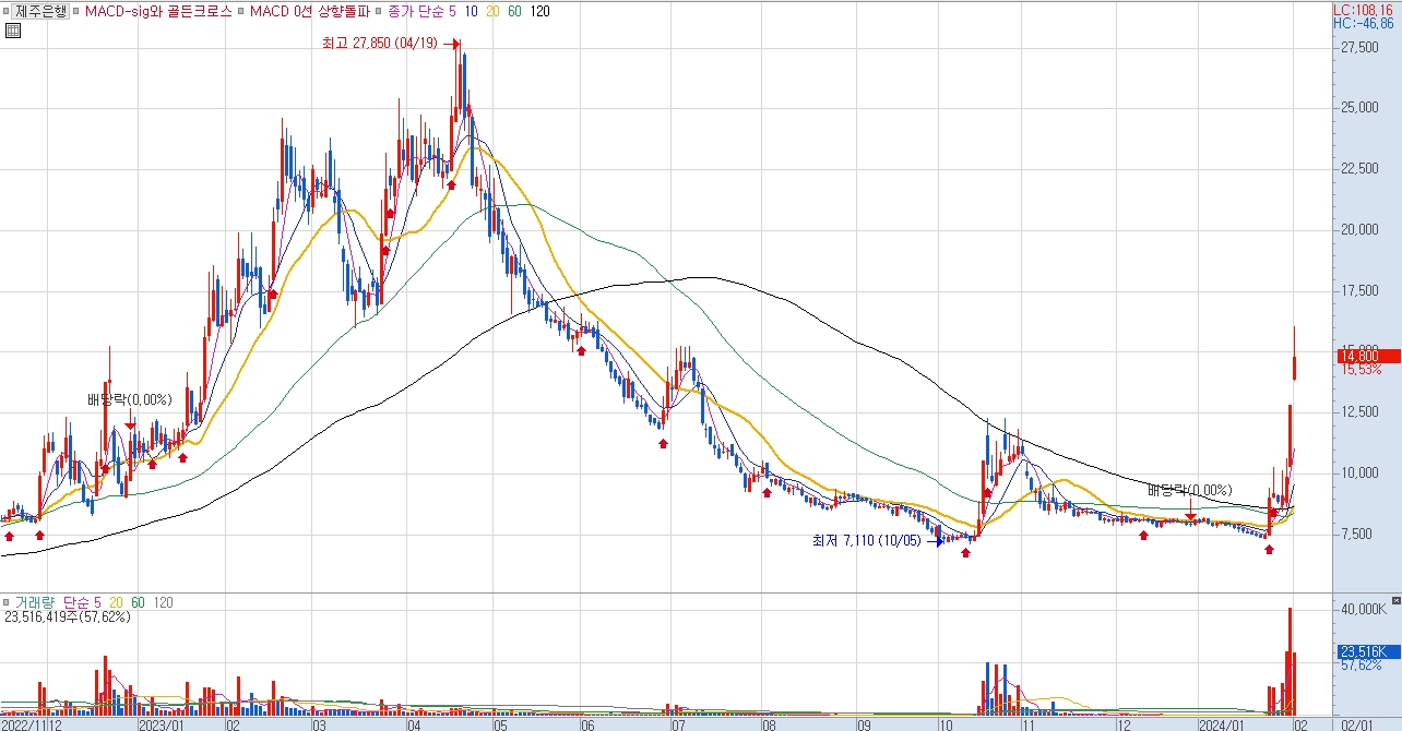제주은행 일봉 차트를 살펴보면 2023년 4월 고점인 27850원을 기록 후 줄곧 급격한 하락세를 이어 오다 최근 저PBR 관련주로 편입 되며 현재가 14000원을 기록 급등세를 보여주고 있습니다.