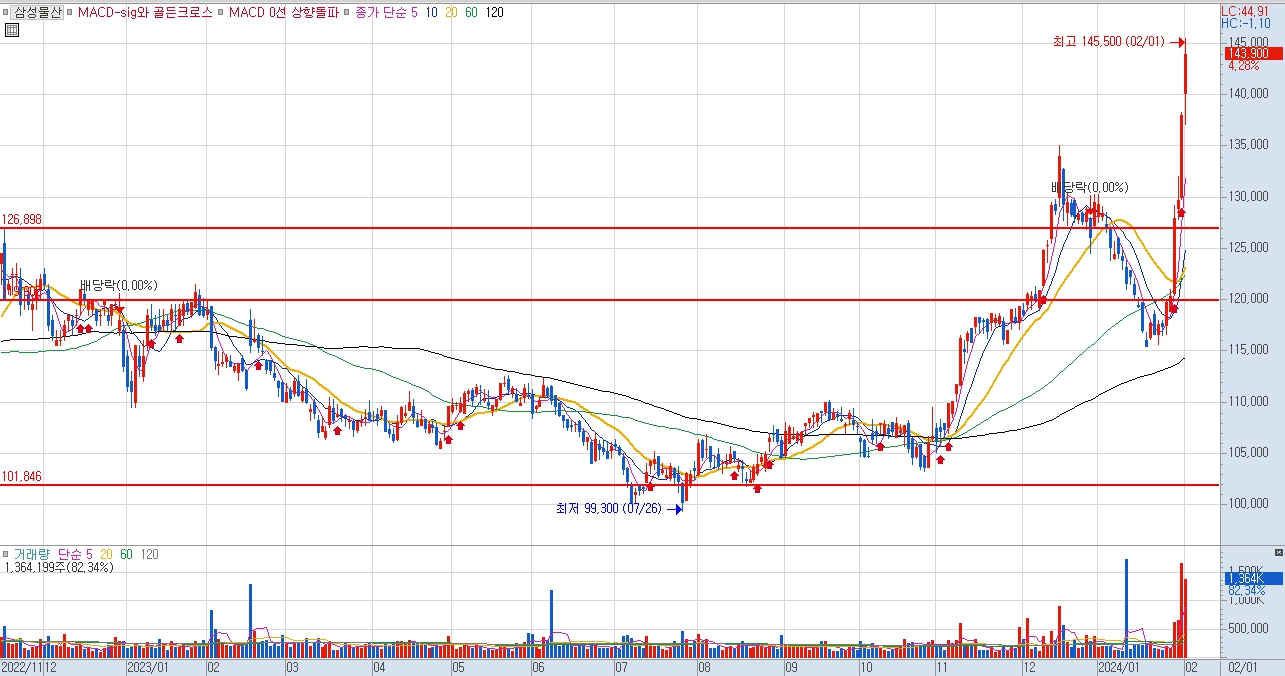 삼성물산 일봉차트를 살펴보면 2022년부터 중장기 하락추세를 이어오던 삼성물산 주가는 최근 저 PBR 관련주로 상승세를 보이며 고점인 145500원을 기록 중에 있습니다.