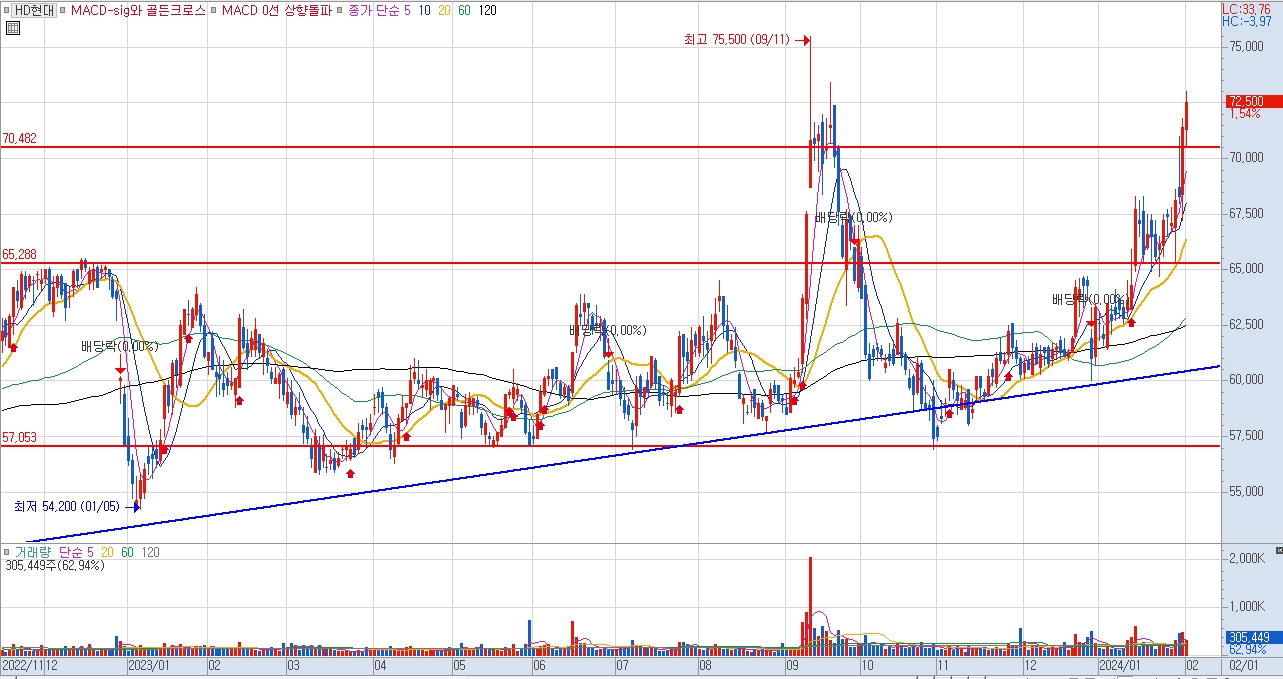 HD현대 일봉 차트를 분석해 보면 2022년 12월부터 큰 박스권을 그리다가 최근 저 PBR 관련주로 2023년 9월 고점을 향해 상승 중에 있습니다.