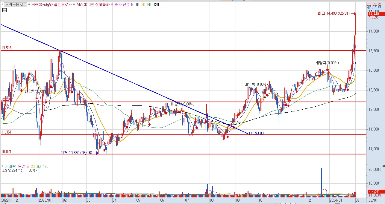 우리금융지주 일봉 차트를 살펴 보면 2022년 3월 부터 중장기 우상향 추세를 만들어오다 최근 저PBR 관련주로 엮이며 현재가 14490원을 기록하며 급등세를 보여주고 있습니다.