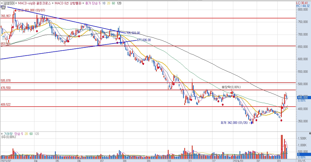 삼성SDI 주가 전망은 단기적으로는 476,000원에서 409,000원 사이에서 매수 타점을 잡기 좋아 보이며 409,000원을 벗어나게 되면 수급이 변할 가능성이 높으므로 손절라인을 설정하거나 추가 매수를 고려해야 합니다.