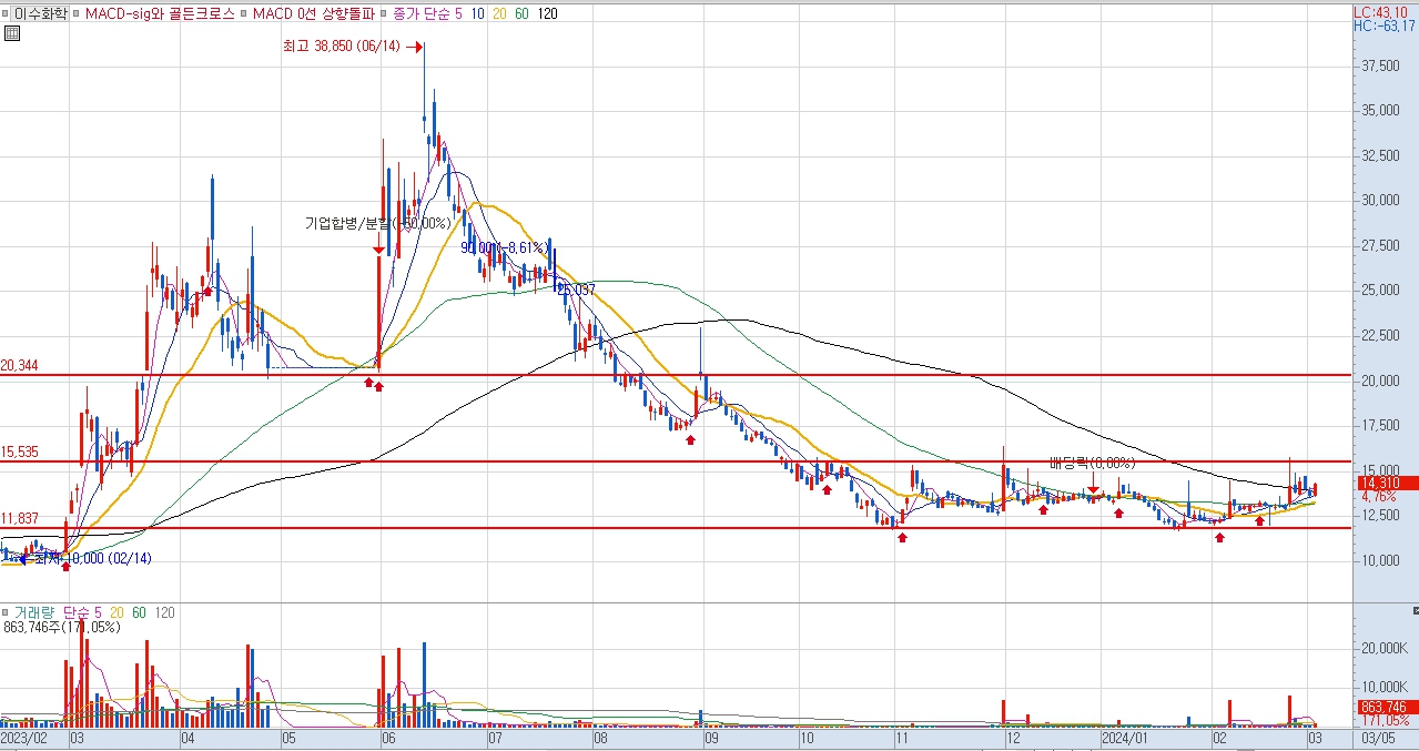 최근의 이수화학 주가 흐름을 살펴보면 2023년 6월 고점인 38,850원을 기록한 이후 중기적인 하락세를 겪고 있으며 박스권을 형성하고 있습니다.