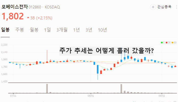 주가 상승이 기대되는 모베이스전자 주가는 2024-09-06 기준 1802원입니다.아래에서 그 동안 모베이스전자 주가 추세가 어떻게 흘러갔는지 확인해보세요.