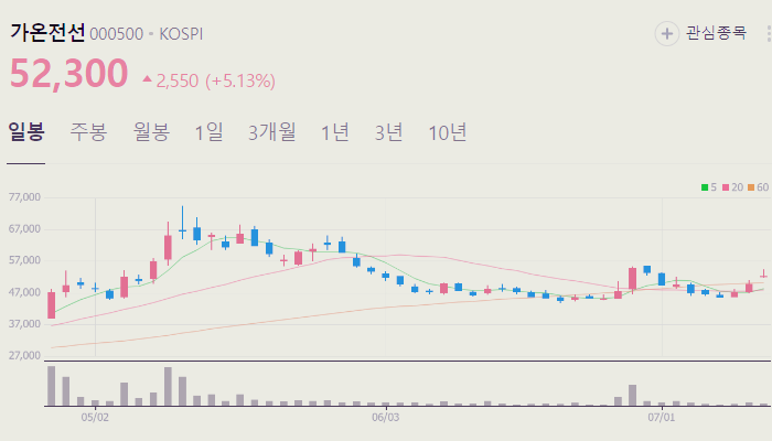 7월10일 기준 가온전선 주가는 52300원입니다.