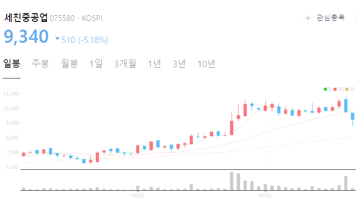7월18일 기준 세진중공업 주가는 9340원입니다.