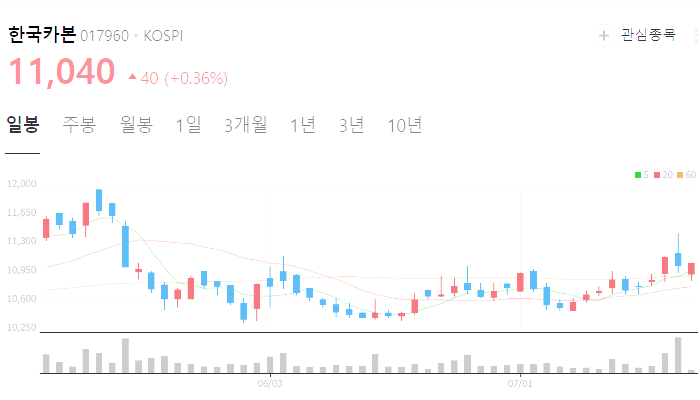 7월18일 기준 한국카본 주가는 11040원입니다.