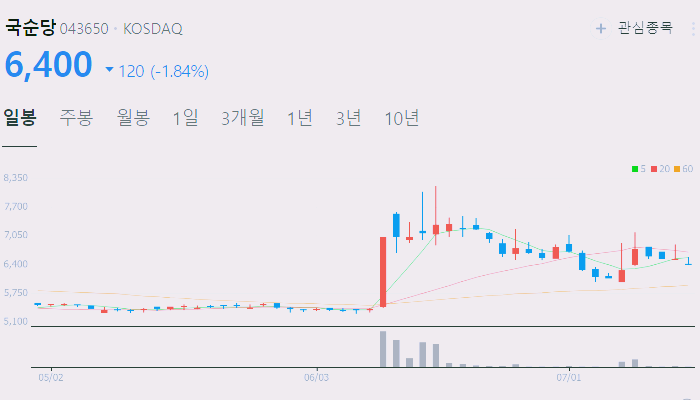 현재 국순당의 주가는 약 5,000원이며, 시가총액은 약 1,143억원입니다.