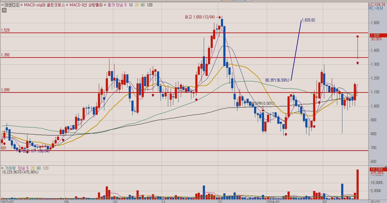 이번 상한가에서 나온 거래량을 감안할 때, 아센디오 주가는 전 고점인 1,650원을 안정적으로 터치할 수 있을 것으로 전망되지만 섣부른 접근은 권장하지 않습니다.