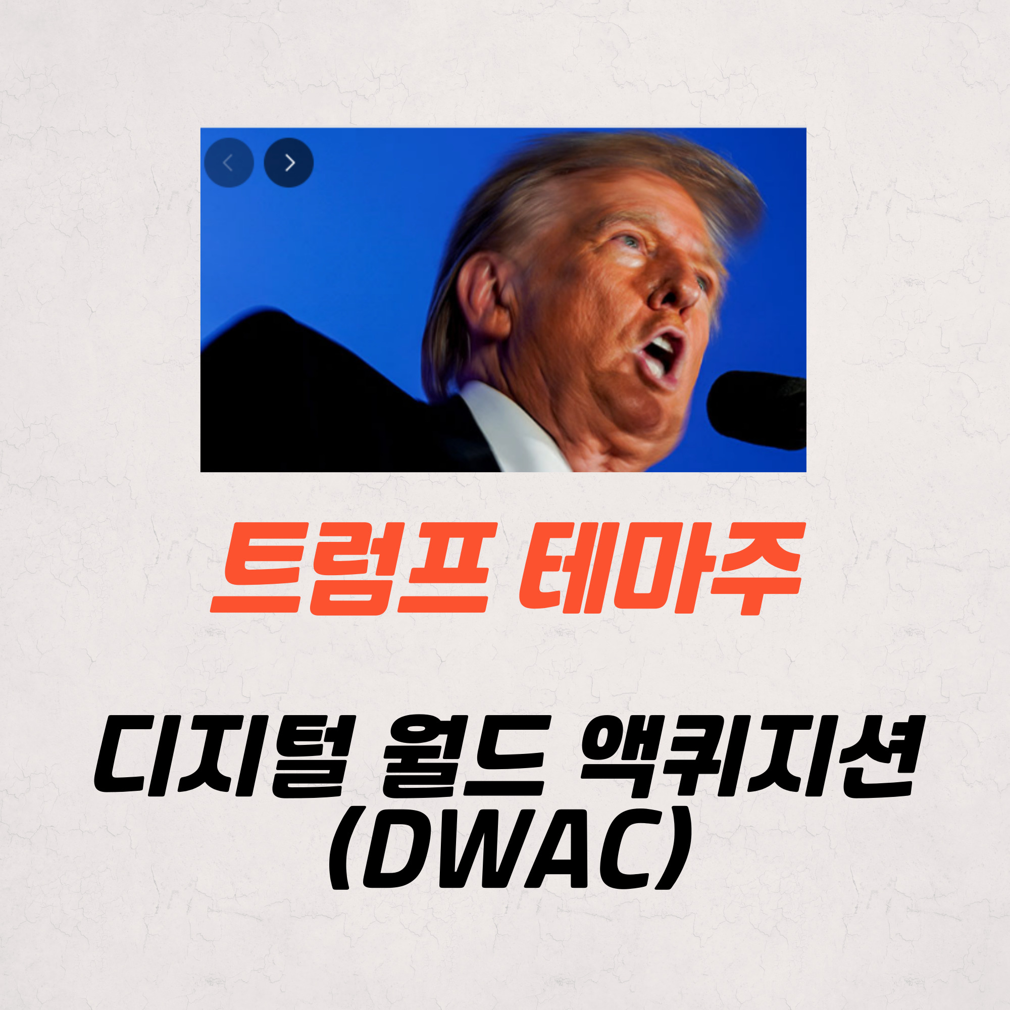 디지털 월드 액퀴지션(DWAC)은 트럼프 전 대통령이 세운 소셜 네트워크 기업 '트루스소셜'을 인수합병해 나스닥에 상장된 기업으로, 해당 트럼프 테마주 주가가 하루 만에 90% 이상 폭등하여 눈길을 끌었습니다.