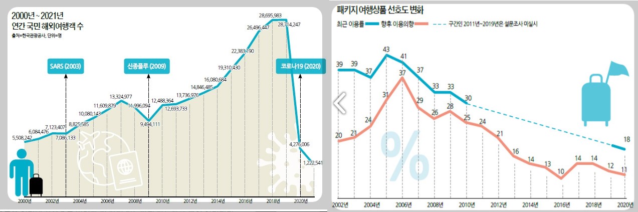 기술의 발달로 인해 정보에 대한 접근이 쉬워지면서 개인이 여행 계획을 세우는 경우가 늘어났습니다. 또한 젊은 세대들은 개인적인 여행 경험을 선호하여 패키지여행 수요가 감소하고 있습니다.
