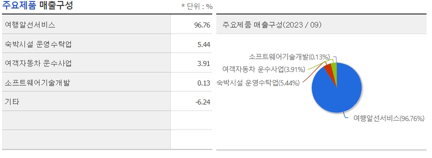 2023년 3분기 기준으로 여행알선 서비스는 전체 매출의 90% 이상을 차지하고 있습니다.