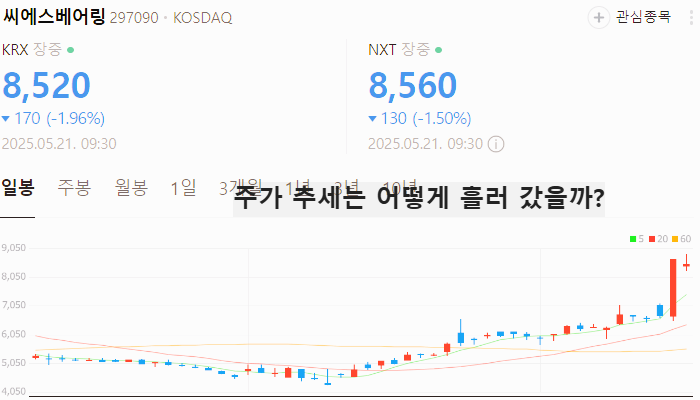 향후 주가 상승이 기대되는 씨에스베어링 주가는 2025년 5월 21일 기준 8520원입니다.