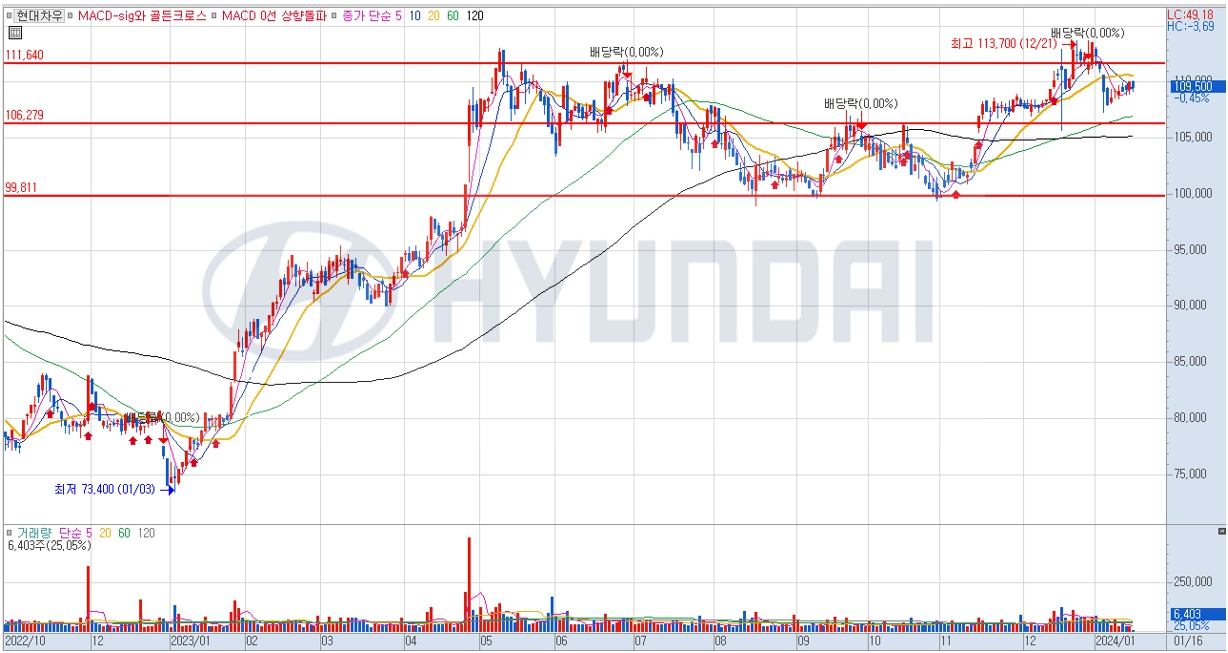 현대차우 : 시가총액 2조 6천억원 ,코스피 순위 116위 , 현재가 109,800원