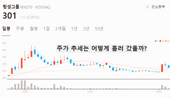 향후 주가 상승이 기대되는 헝셩그룹 주가는 2024년 12월 6일 기준 301원입니다.