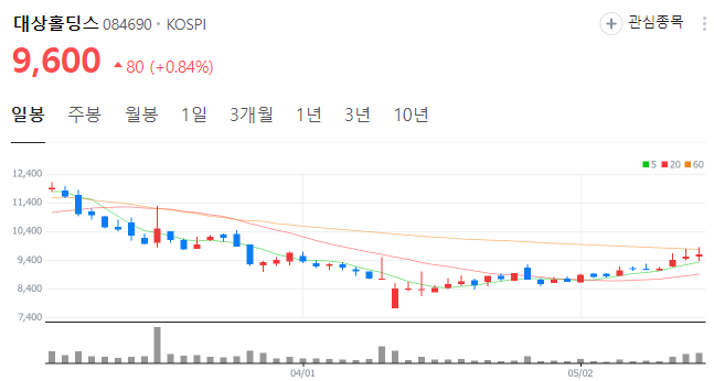 5월 17일 기준 대상홀딩스 주가는 9600원을 기록하고 있습니다. 현재의 실시간 대상홀딩스 주가 추세를 아래에서 확인해 보세요.