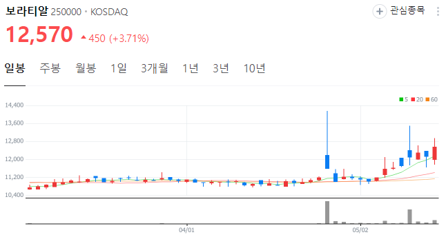 5월 17일 기준 보라티알 주가는 12570원을 기록하고 있습니다. 현재의 실시간 보라티알 주가 추세를 아래에서 확인해 보세요.