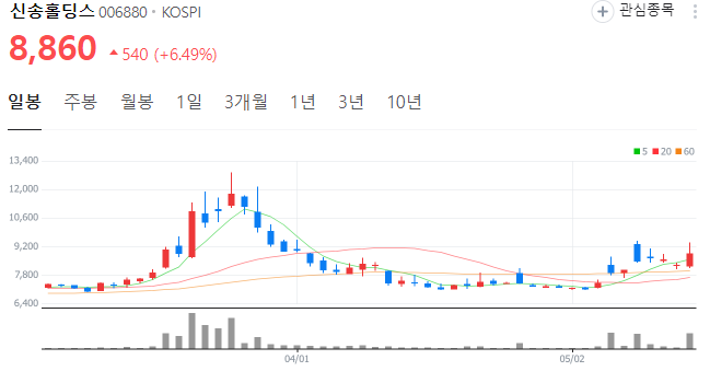 5월 17일 기준 신송홀딩스품 주가는 8860원을 기록하고 있습니다. 현재의 실시간 신송홀딩스 주가 추세를 아래에서 확인해 보세요.