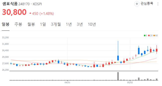 5월 17일 기준 샘표식품 주가는 30800원을 기록하고 있습니다. 현재의 실시간 샘표식품 주가 추세를 아래에서 확인해 보세요.