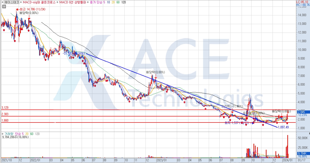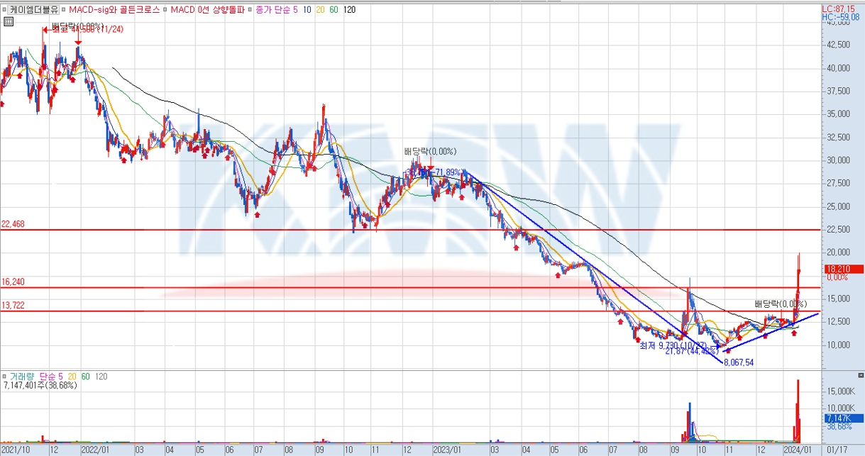 케이엠더블유의 주가 전망을 살펴보면, 2022년부터 중장기적인 하락 추세를 이었지만, 2023년 11월에 들어와 단기 상승 추세를 나타내고 있는 것으로 보고 있습니다.