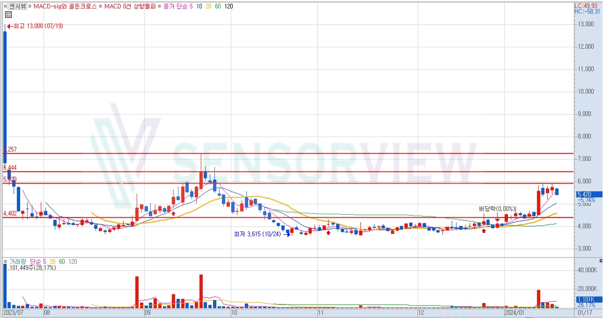 센서뷰 주가 차트를 살펴보면 2023년 7월 상장 이후 장대음봉을 기록하며 급락세를 보인 후 최근까지 바닥을 다지다가 2024년 1월 들어와 반등세에 위치하고 있습니다.