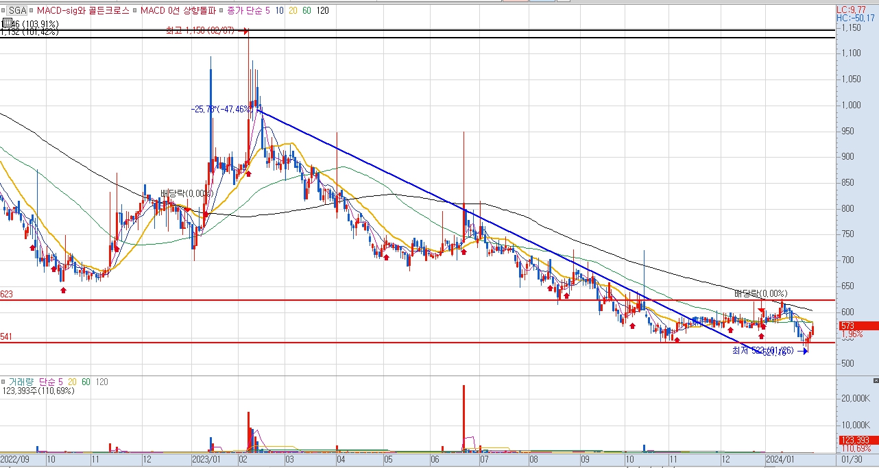 SGA 주가 전망을 분석해 보면 2023년 1월 고점인 1150원을 기록후 중장기적인 우하향 추세를 보여주고 있는데 최근 들어와 단기 박스권을 만들어 가는 모습입니다.