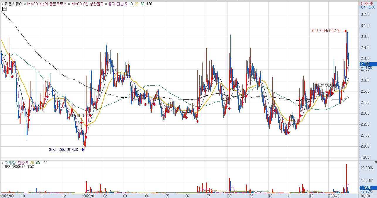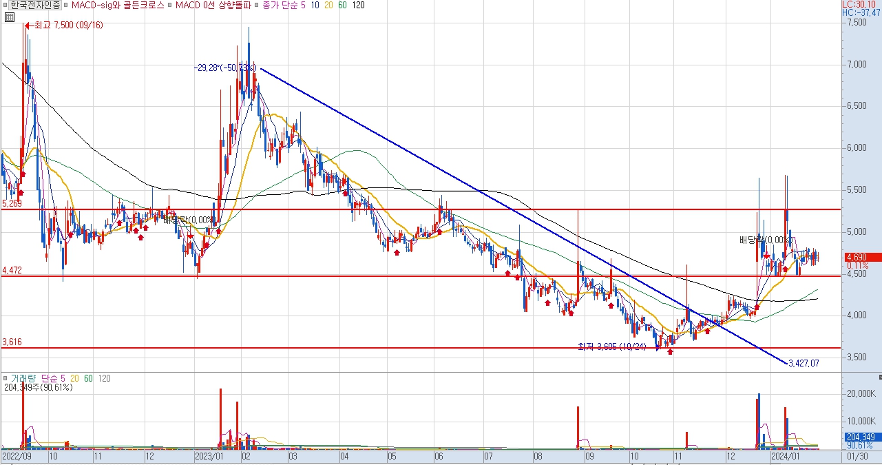 한국전자인증은 주가 전망을 살펴보면 지난 2023년 1월 고점인 7500원을 기록 후 중장기 적인 우하향 추세를 보여주다가 최근 1월 들어와 대량 거래량과 함께 반등세에 위치해 있습니다.