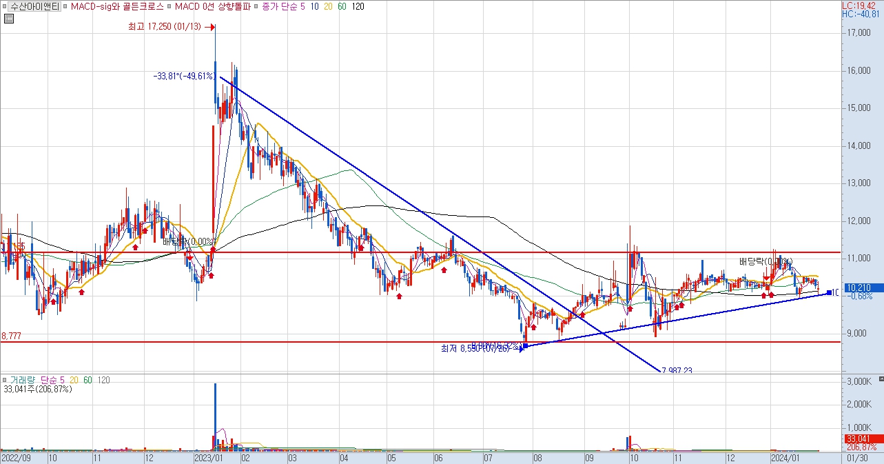 수산아이엔티 주가 전망을 분석 해보면 지난 2023년 01월 중장기 우하향 추세를 보여주던 주가는 10월 부터 횡보 추세를 유지 하고 있습니다.