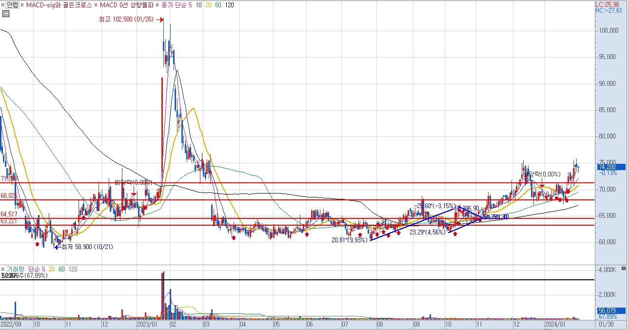 안랩 주가 전망을 살펴보면 2023년 10월 까지 꾸준하게 바닥을 다져 오다 이후 점차 우상향 추세로 전환 된 모습을 보여주고 있습니다. 향후 전고점인 76000원 부근을 돌파해 준다면 긍정 적인 주가 전망이 기대 됩니다.