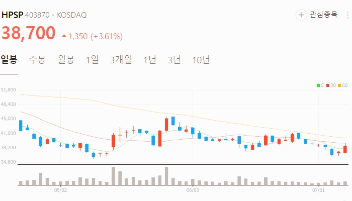 7월6일 기준 HPSP 주가는 38700원입니다. 아래에서 이 글을 읽고 있는 순간 HPSP 주가 추세를 확인해 보세요.