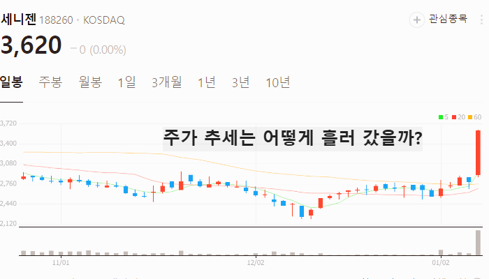 아래에서 그 동안 세니젠 주가 추세가 어떻게 흘러갔는지 확인해보세요.