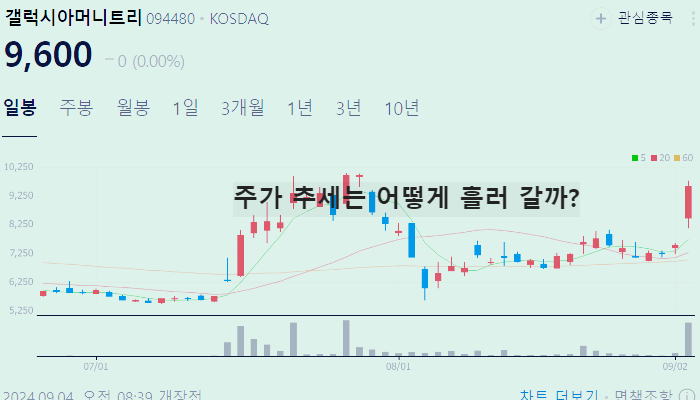 개인적으로 큰 상승이 기대되는 갤럭시아머니트리 주가는 2024-09-04 기준 9600원입니다.