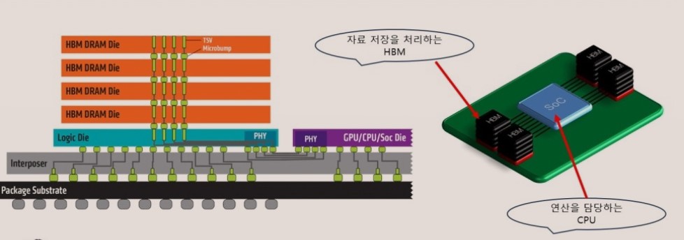 HBM(고대역폭 메모리)은 CPU와 GPU 사이에서 데이터 전송을 더욱 효율적으로 처리하는 칩으로, 일반 메모리와는 다르게 반도체를 층별로 쌓을 수 있어 공간 절약과 전력 소비 절감에 기여합니다.