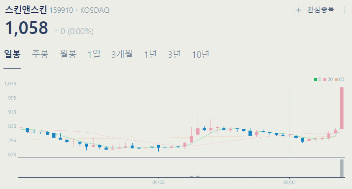 6월 17일 기준 스킨앤스킨 주가는 1058원입니다. 아래에서 이 글을 읽고 있는 순간 스킨앤스킨 주가 추세를 확인해 보세요.